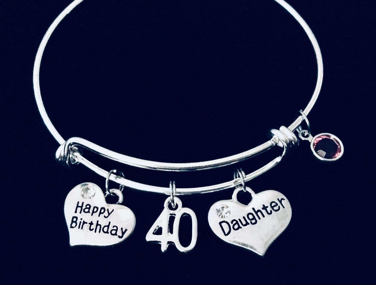 Celebrate your daughter's 40th birthday with this personalized charm bracelet. Featuring a Happy Birthday, birthstone, and number 40 charm, this silver-plated bangle is adjustable to fit any wrist. Made with high-quality components, it is both durable and elegant. Give the gift of meaning and thoughtfulness with this expandable charm bracelet.