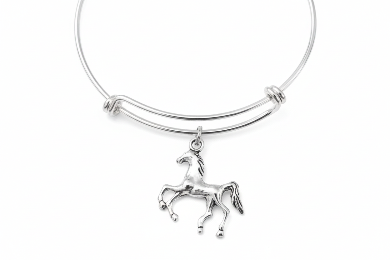 Horse Charm Bracelet – Silver Expandable Bangle with Galloping Horse – Equestrian Jewelry Gift for Women & Girls