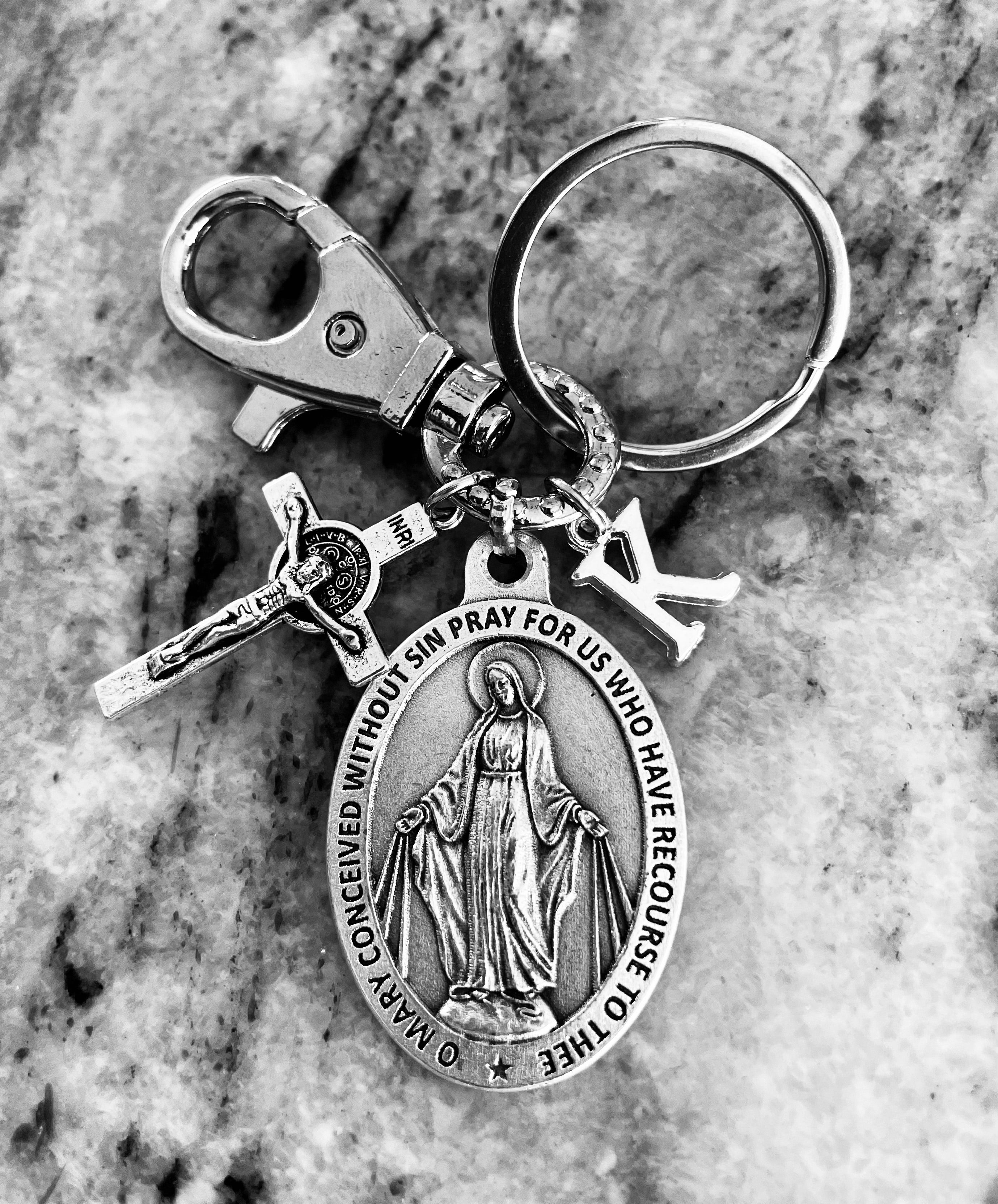 This handcrafted Miraculous Mary Keychain features a detailed religious medal with the prayer “O Mary conceived without sin, pray for us who have recourse to thee”. Paired with a crucifix and a personalized initial charm, it’s a meaningful keepsake for daily devotion.