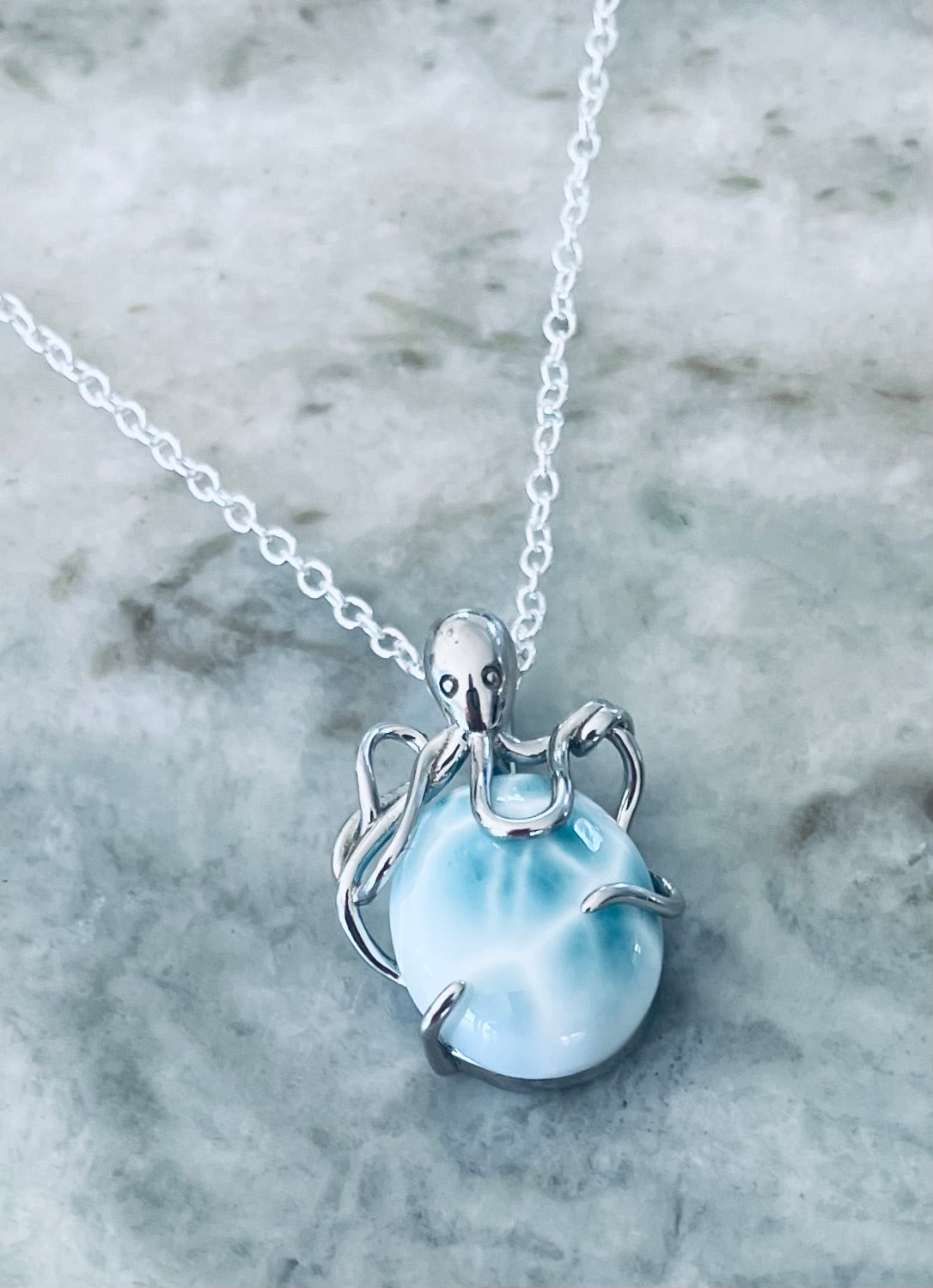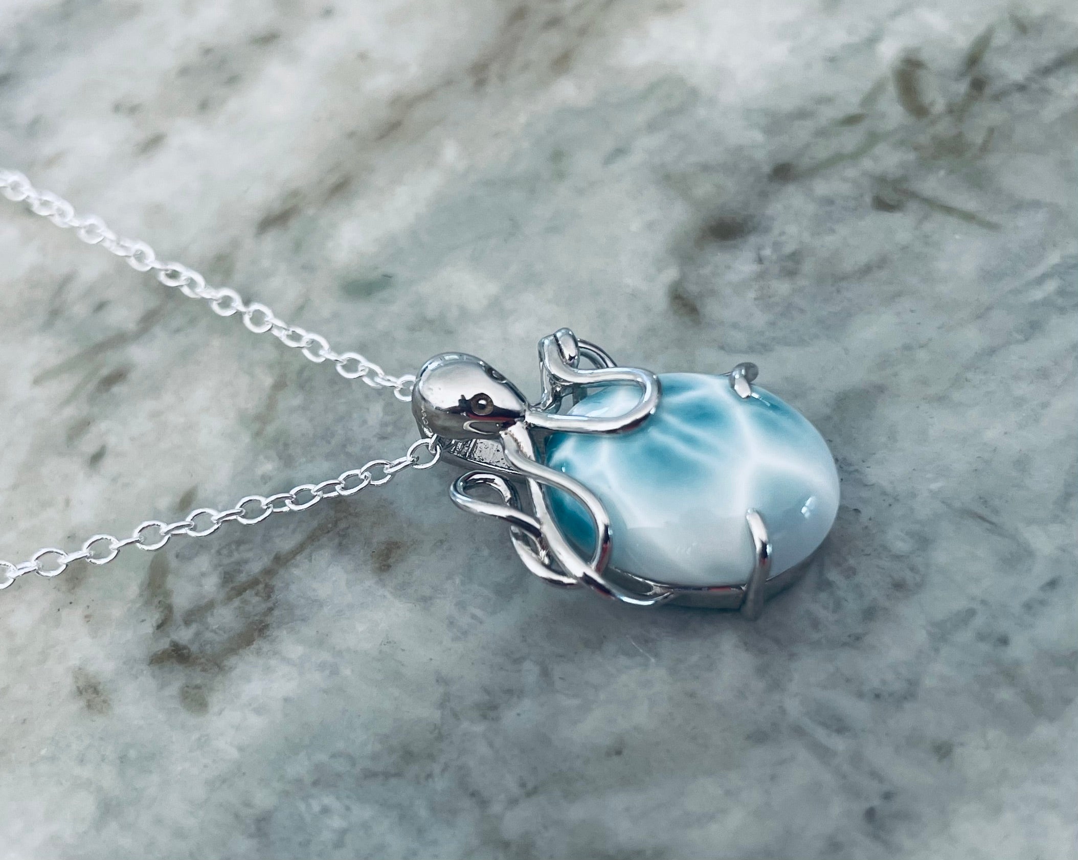 Dive into ocean-inspired elegance with this Larimar Octopus Pendant Necklace, handcrafted from 925 sterling silverand featuring a genuine Dominican Larimar gemstone. The pendant showcases a playful yet detailed octopus design, with its arms gracefully wrapping around a natural Larimar cabochon.