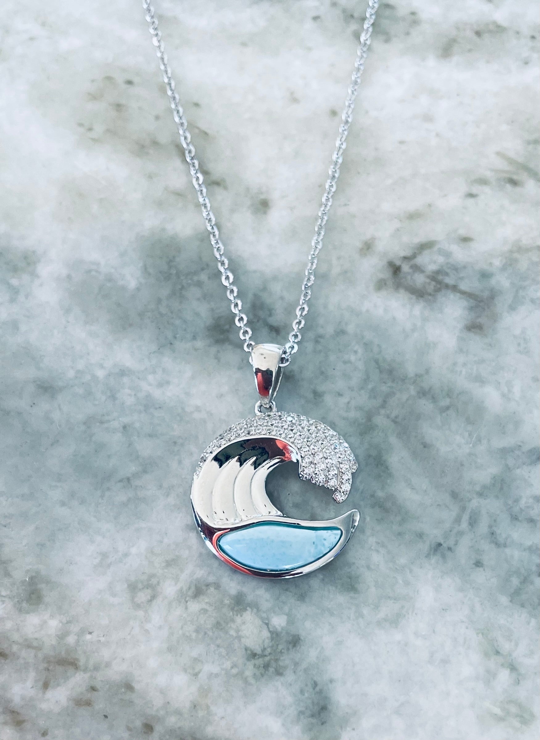 Ride the beauty of the sea with this Larimar Wave Necklace, handcrafted in 925 sterling silver and accented with a genuine Larimar gemstone. The elegant wave design captures the power and serenity of the ocean, while shimmering silver details add a touch of brilliance.