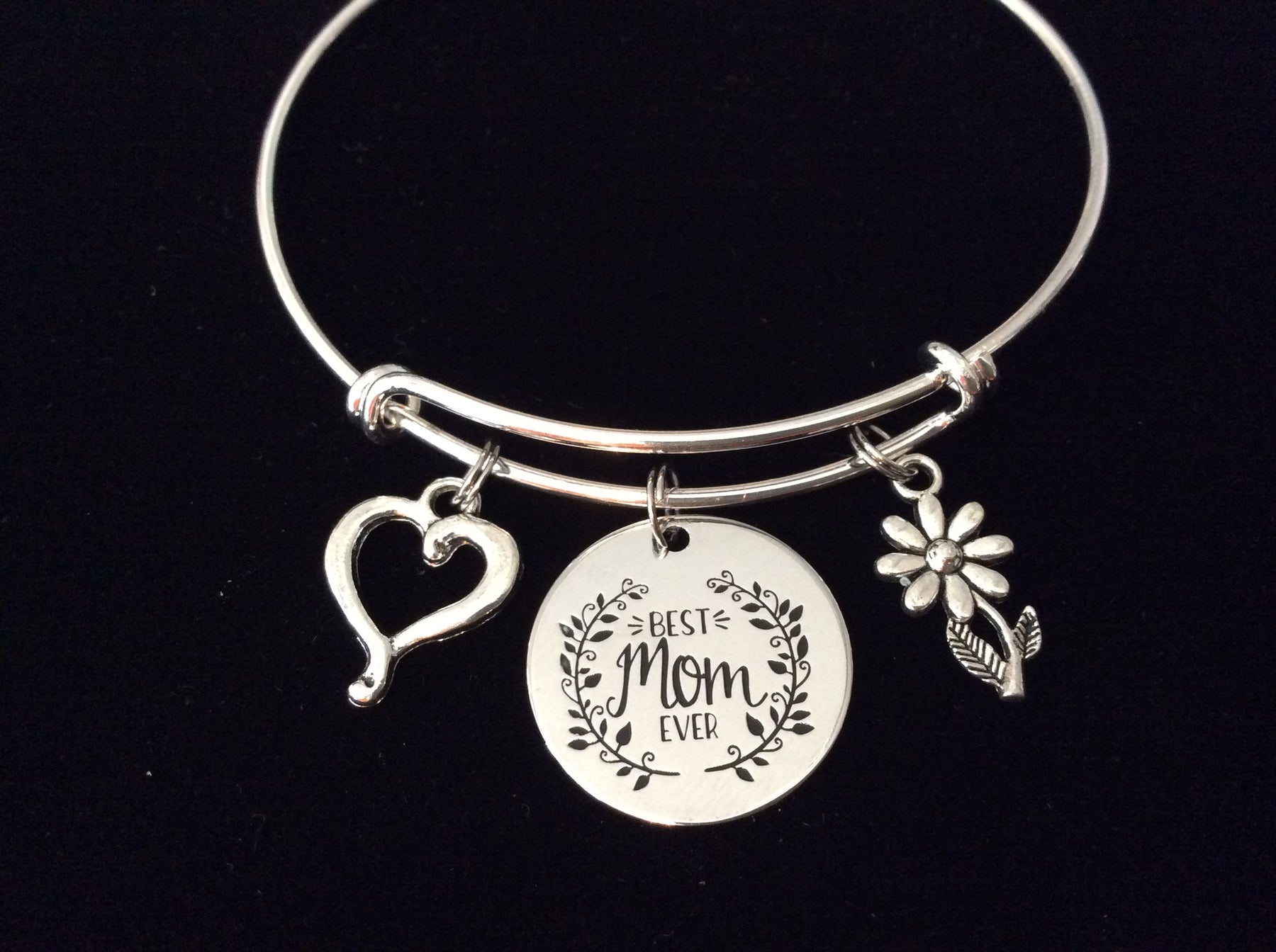 Best Mom Ever Bracelet – Silver Heart, Daisy & Engraved Disc Charm Bangle | Mother’s Day Gift