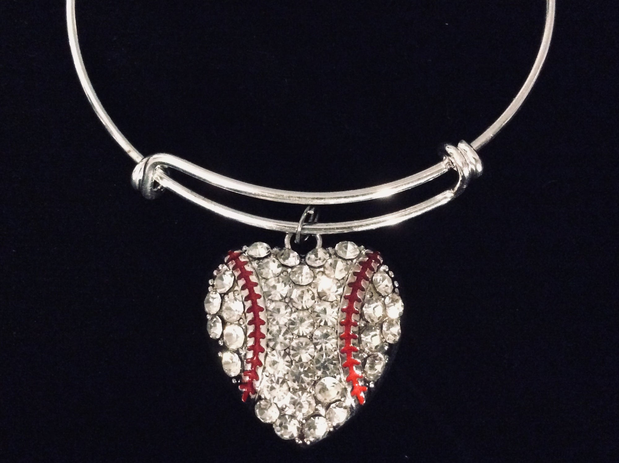 Crystal Heart Shaped Baseball Jewelry Rhinestone Adjustable Charm Bracelet Silver Expandable Bangle One Size Fits All Gift