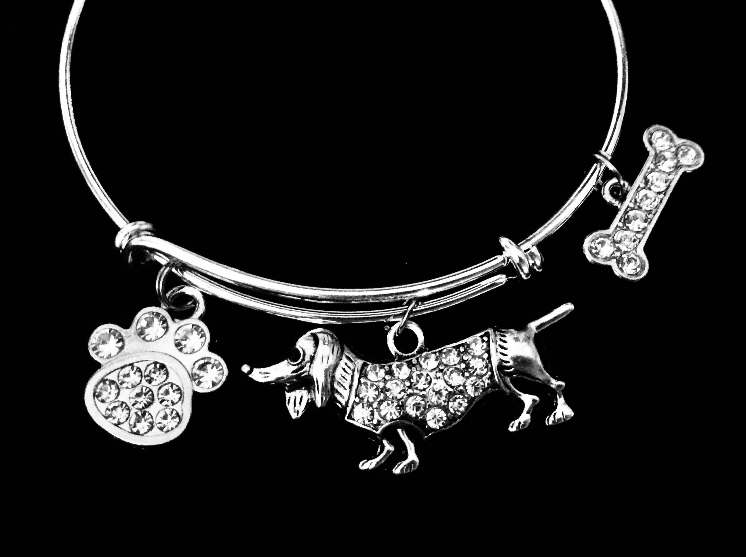 Elevate your style and show off your love for dachshunds with this charming bracelet. Adorned with sparkling paw prints and a bone charm, this expandable silver bangle is a perfect fit for all wrist sizes. A must-have accessory for any animal lover.