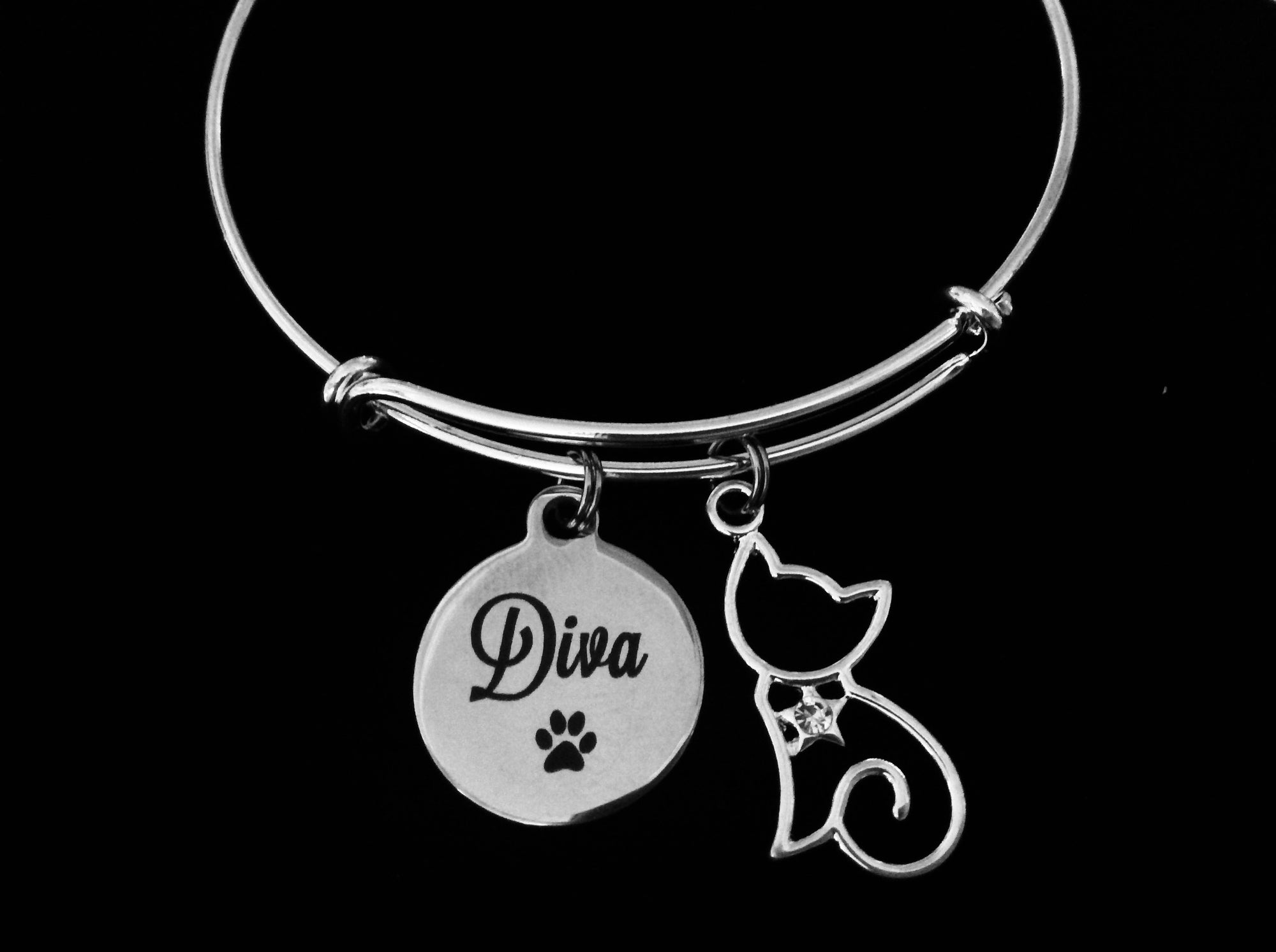 Diva Cat Jewelry Adjustable Bracelet Expandable Charm Bangle Animal Lover Gift Kitten Crystal Rhinestone One Size Fits All Paw Print