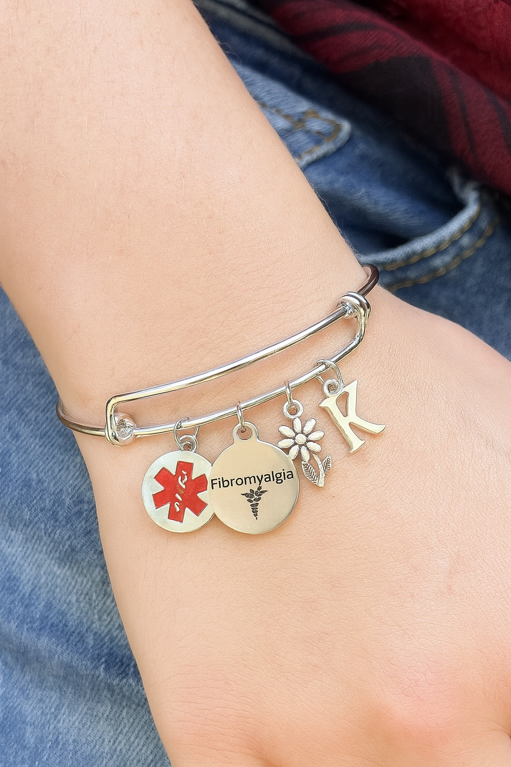 Stay safe in style with this Fibromyalgia Medical Alert Bracelet – a beautiful and functional piece for women managing chronic illness. This silver expandable bangle features: