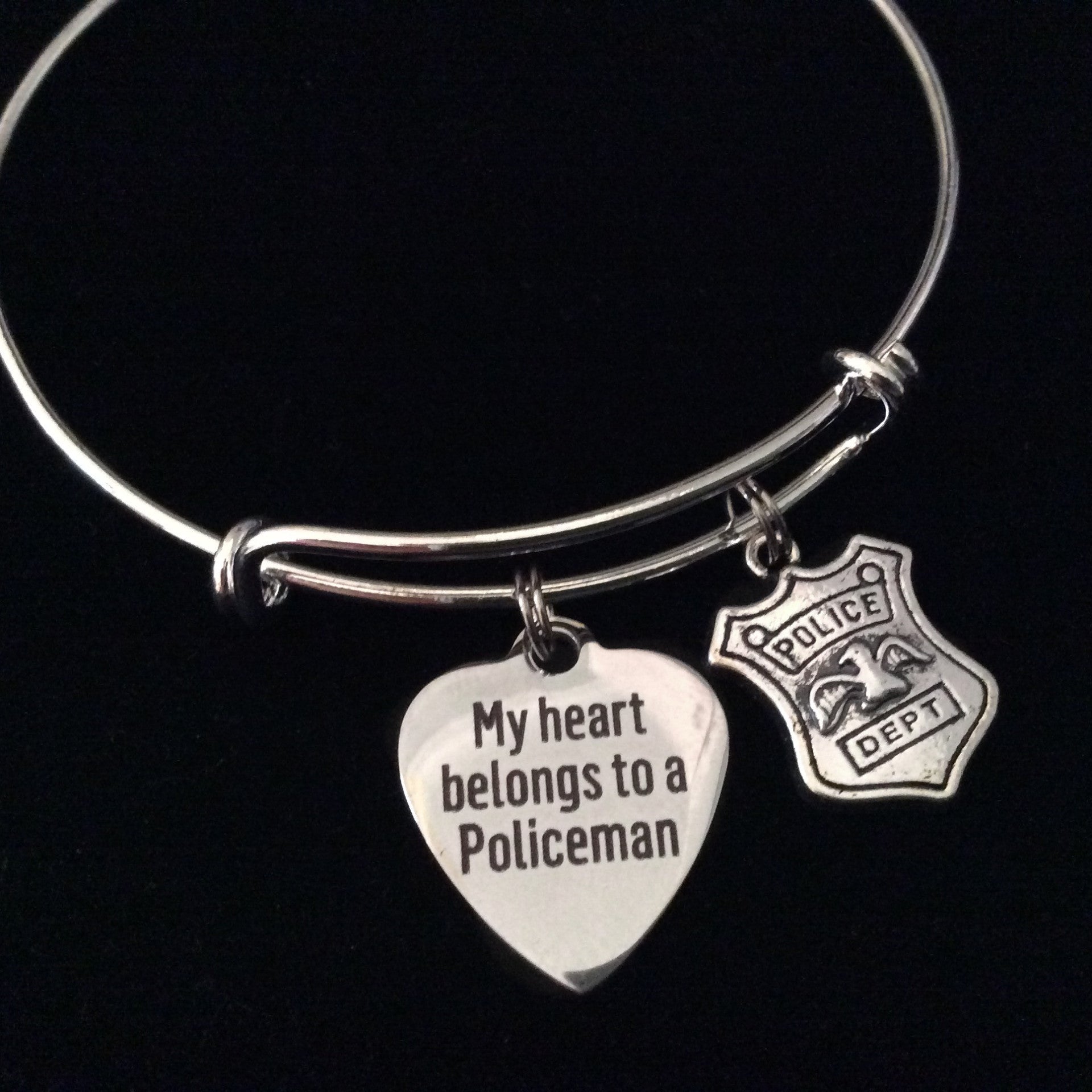 Stainless Steel Stamped My Heart Belongs to a Policeman with Police Department Badge charm securely attached to a Silver Plated Expandable Bangle Bracelet. Inspirational and Meaningful Gift.