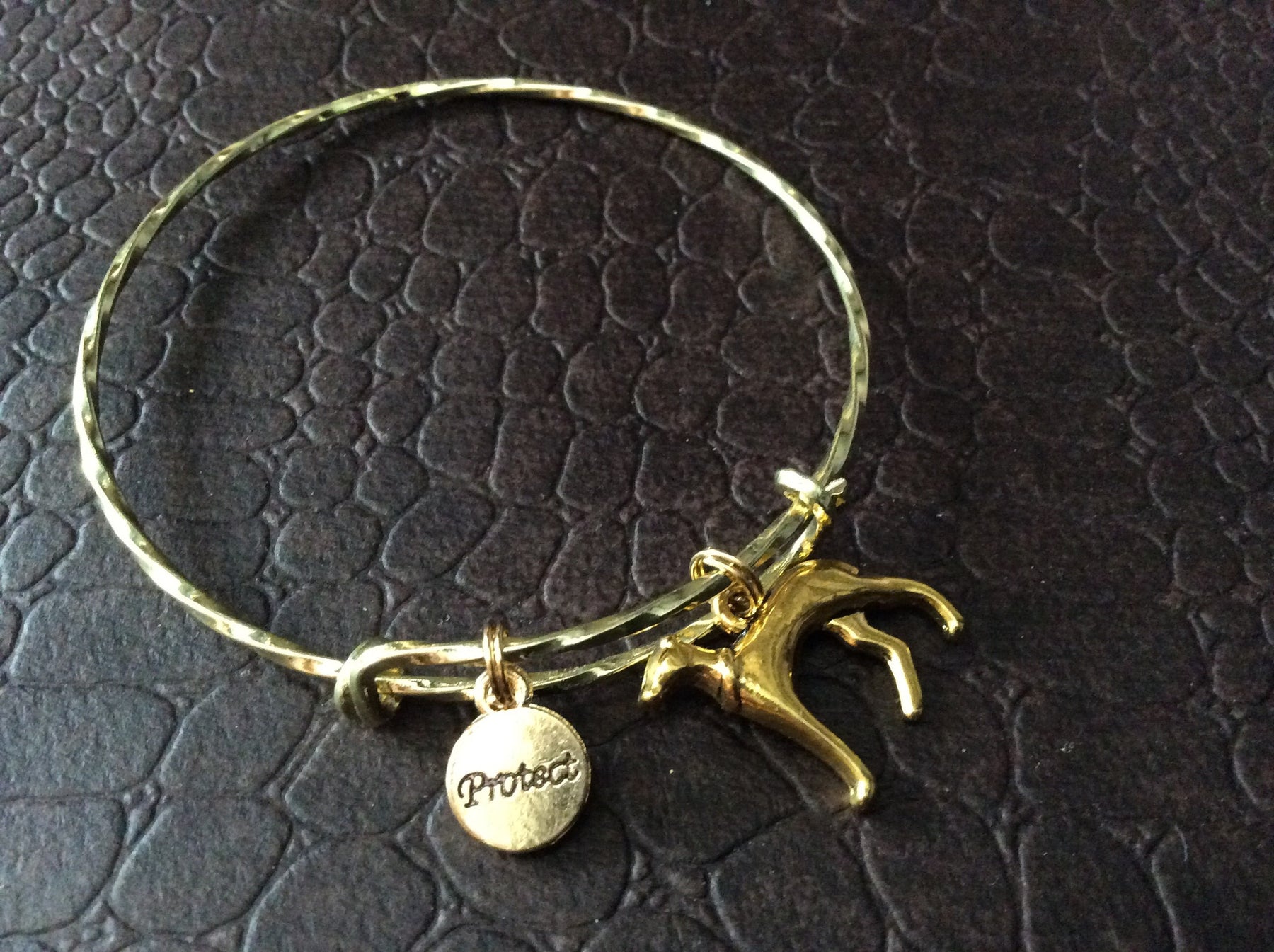 Add some protection and love to your outfit with this elegant Protection Charm bracelet. Featuring a Black Paw Print Charm with "Protect" stamped on the other side and a Gold Double Sided Greyhound Dog Charm, this handmade bracelet is adjustable and fits all sizes. Perfect for pet lovers and as a unique gift. Made in America.