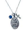 Silver Oxidized Saint Charm Made in Italy, Stainless Steel Chain, Stainless Steel Cross, and Swarovski Crystal Birthstone.