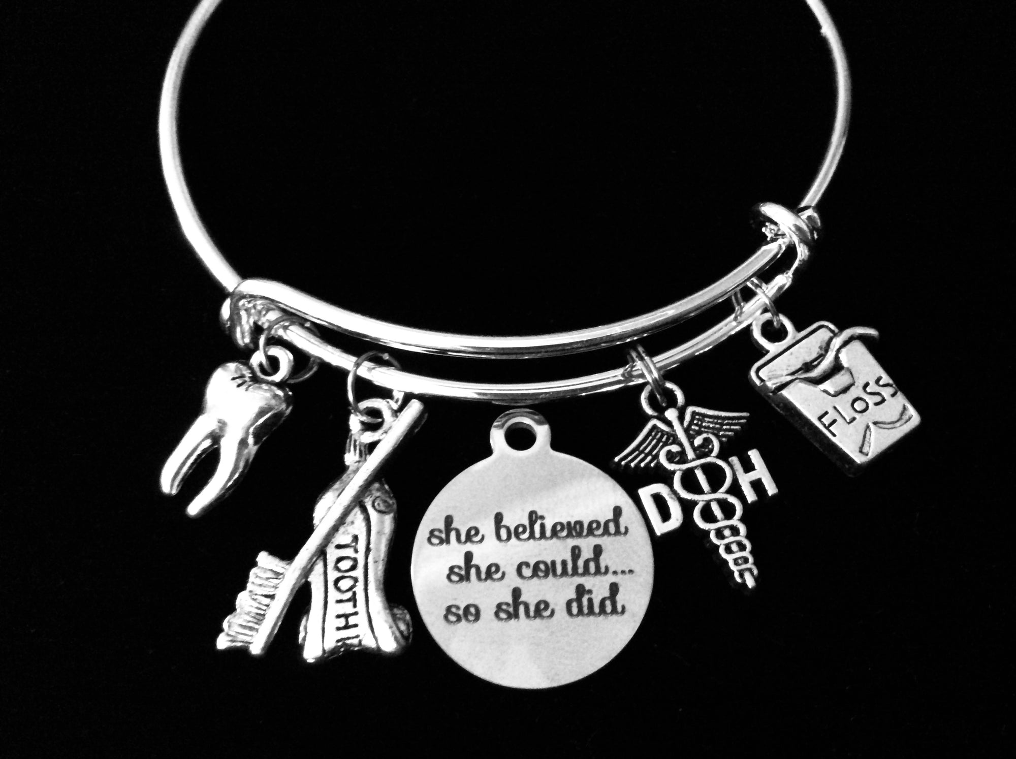 Celebrate the dedication of dental professionals with this handmade charm bracelet. Designed with five meaningful charms—including a tooth, toothbrush, floss, RDH medical caduceus, and a round engraved pendant reading She Believed She Could, So She Did—this bracelet makes a stylish and motivational keepsake.