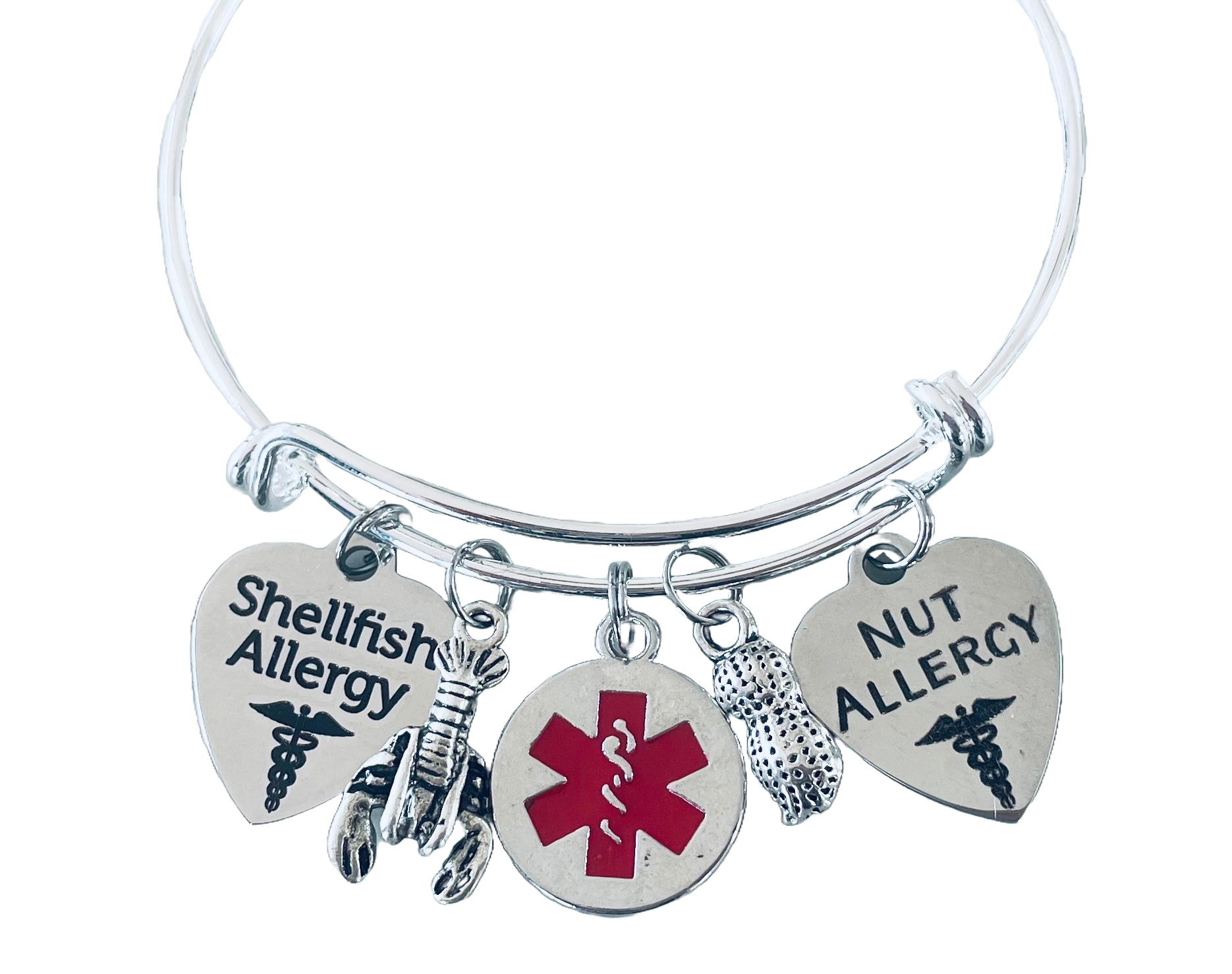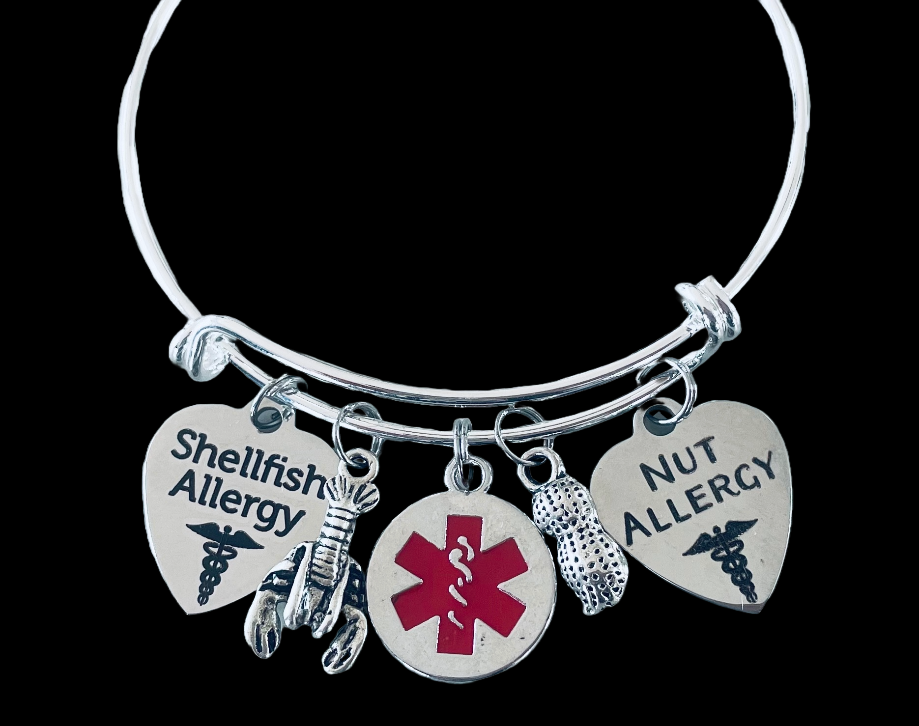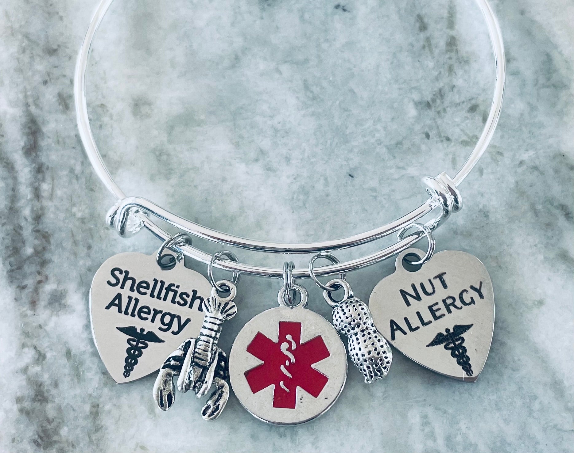 Shellfish and Nut Allergy Medical Alert Expandable Charm Bracelet Silver Adjustable Bangle Gift