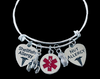 Stay stylish and safe with this Shellfish and Nut Allergy Medical Alert Expandable Charm Bracelet. Designed to alert others in emergencies, this silver-tone bangle features engraved heart charms for “Shellfish Allergy” and “Nut Allergy,” along with a red medical symbol, lobster, and peanut charms.