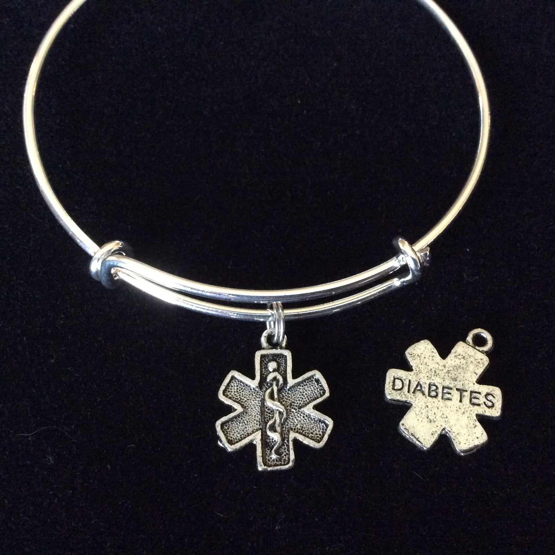 Silver Diabetic Medical Alert (Double Sided Charm) on an Adjustable Bangle Bracelet Diabetes Charm Bangle Trendy Gift