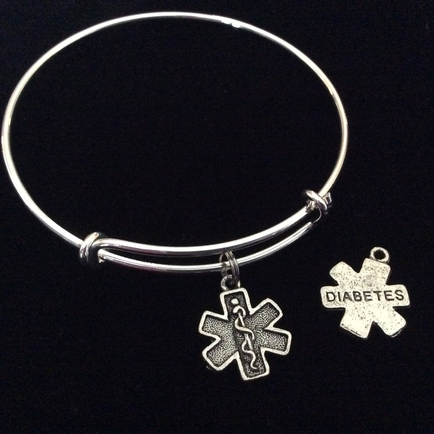 Silver Diabetes Double sided Diabetic Medical Symbol Charm securely attached to an adjustable expandable wire bangle bracelet. Trendy, Stackable Bracelet.